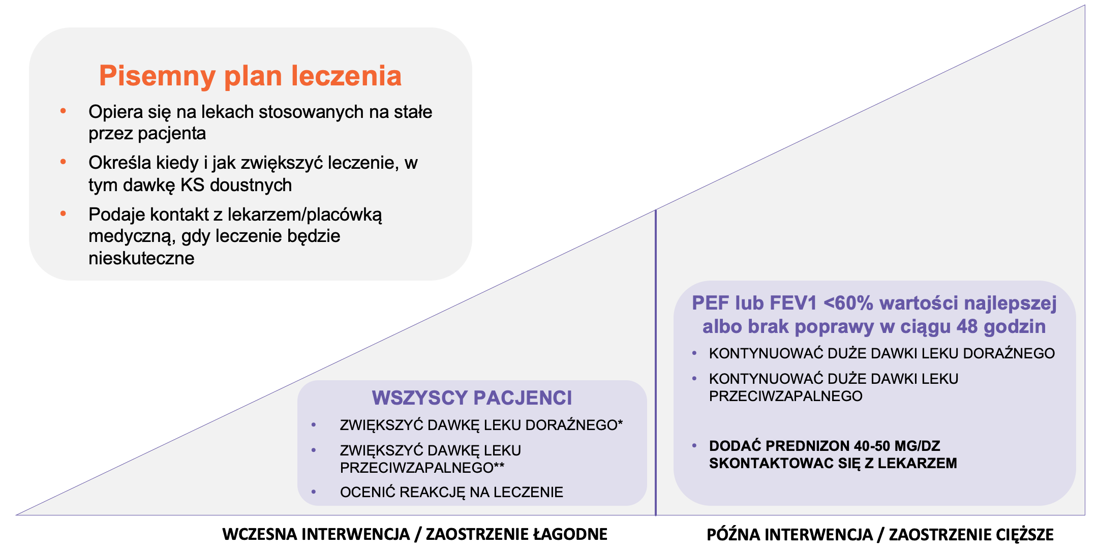 * SABA, lub dodatkowa dawka FOR/wGKS jeśli chory stosuje lek złożony (np. BUD/FOR: dla chorych leczonych Symbicortem, Symbicort jest lekiem doraźnym!)