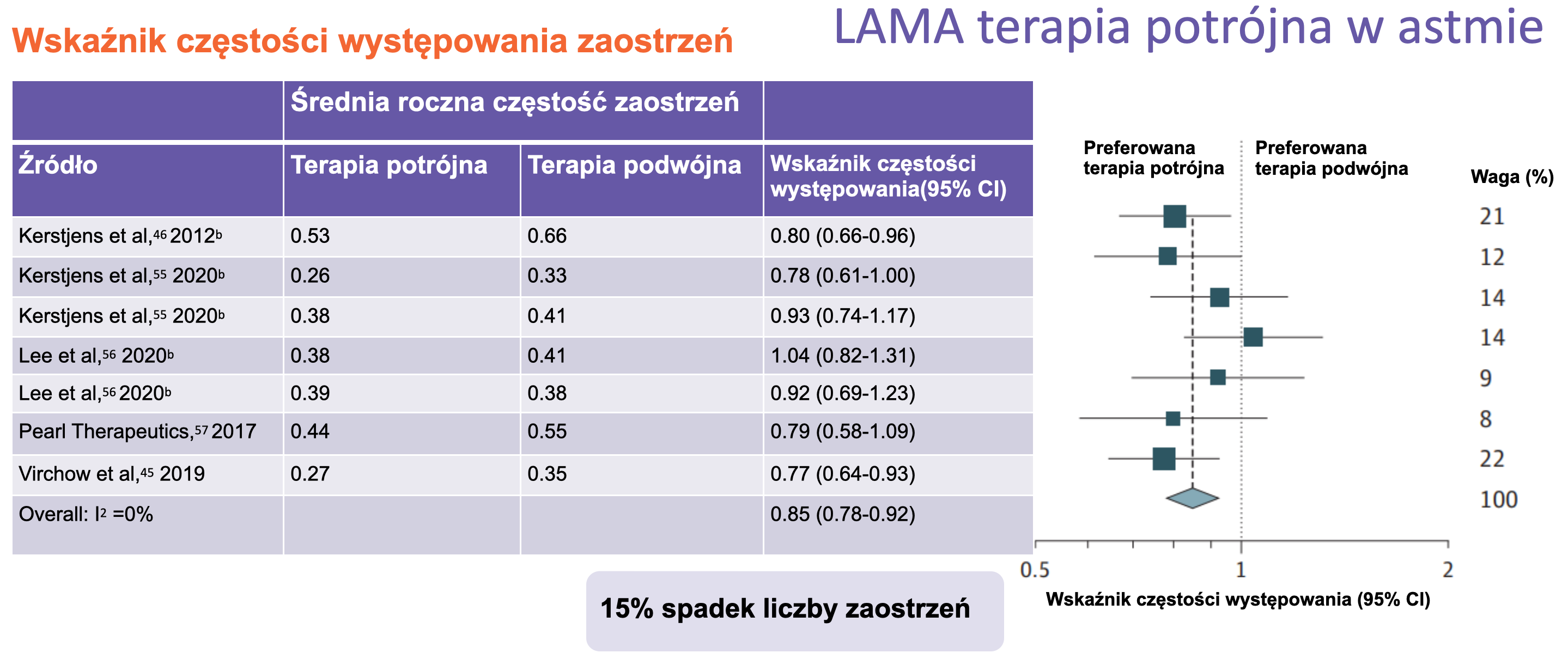 Częstość zaostrzeń astmy w randomizowanych badaniach porównujących terapię podwójną i potrójną
