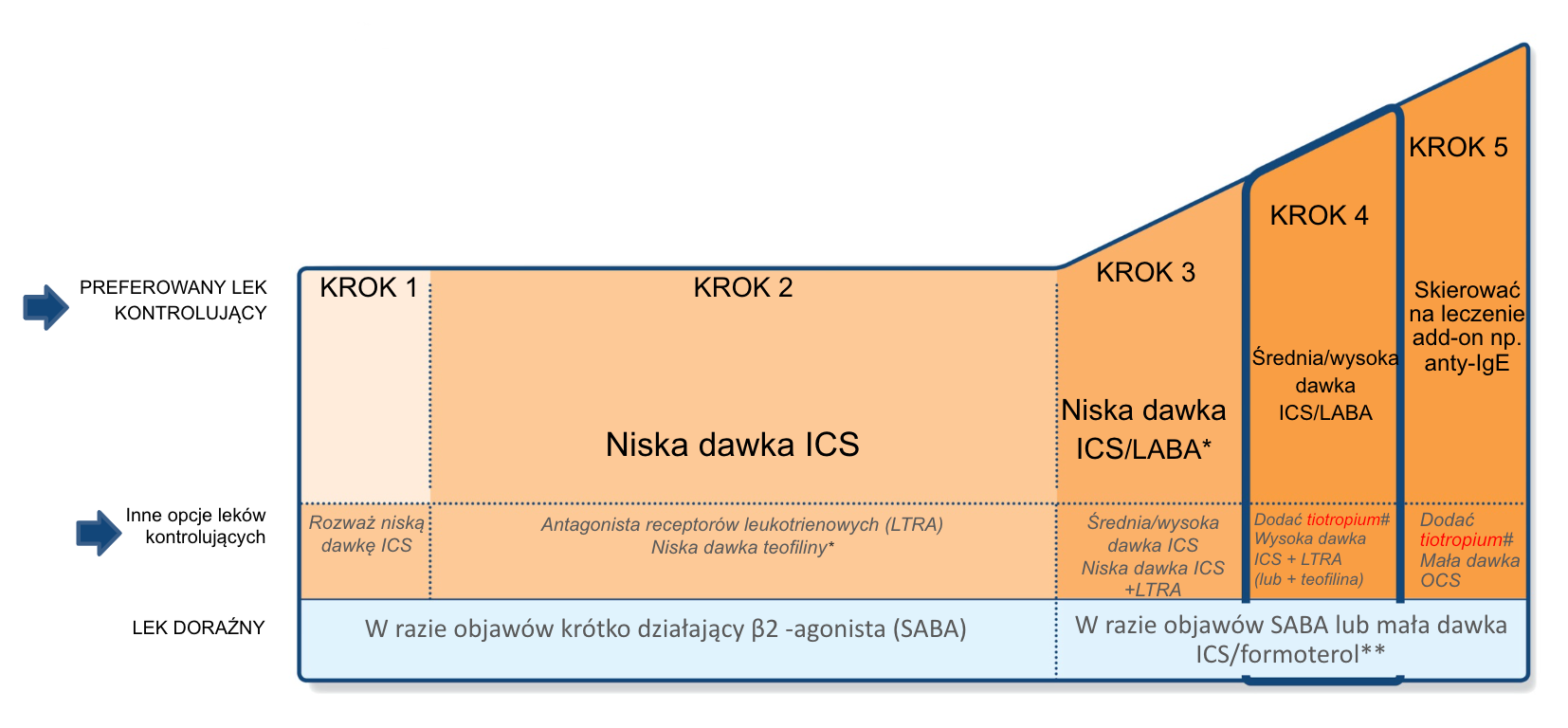 *Dla dzieci w wieku 6-11 lat, teofilina nie jest zalecana, a preferowanym krokiem 3 jest średnia dawka ICS