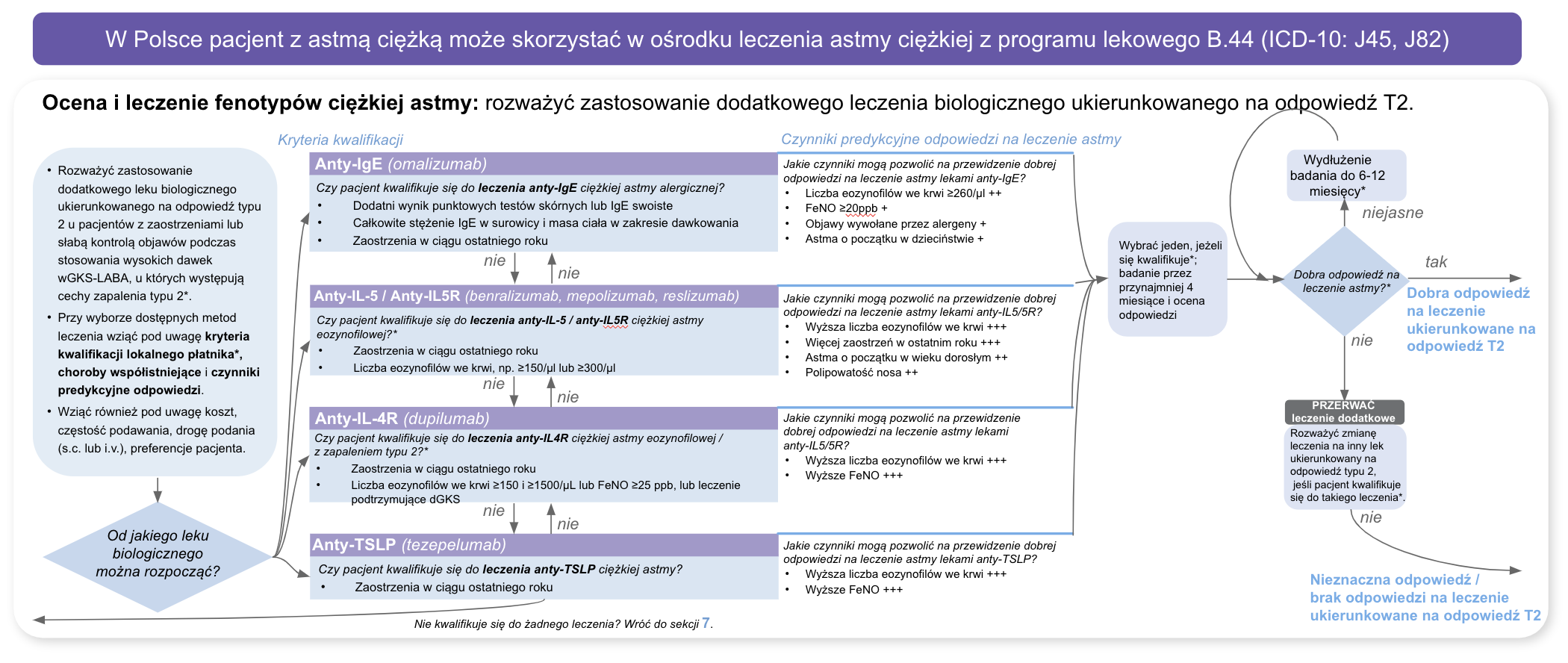 *Ciężka astma charakteryzuje się brakiem możliwości osiągnięcia odpowiedniej kontroli za pomocą wysokich dawek wziewnych kortykosteroidów i dodatkowych leków kontrolujących lub leczeniem doustnymi kortykosteroidami, lub utratą kontroli po zmniejszeniu dawki leczenia.