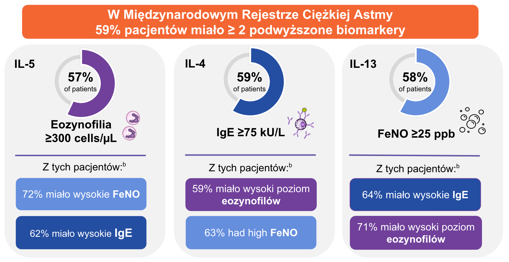 aPozytywność markerów biologicznych została zdefiniowana jako całkowite IgE ≥75 kU/L, liczba eozynofili we krwi ≥300 komórek/µL oraz FeNO ≥25 ppb wśród 1175 dorosłych pacjentów;