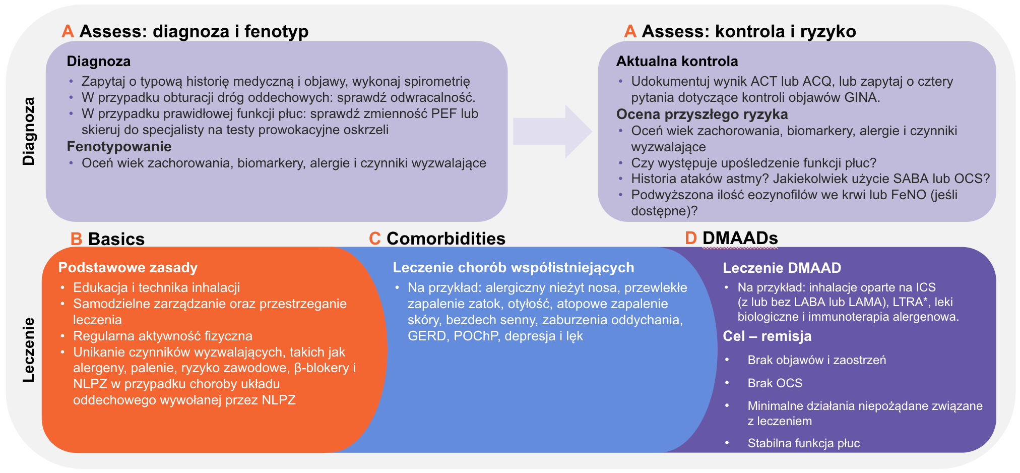*Terapie oparte na ICS preferuje się nad LTRA, które są obecnie stosowane z rezerwą ze względu na umiarkowaną skuteczność oraz możliwe działania niepożądane (np. US Food and Drug Administration black box warning)